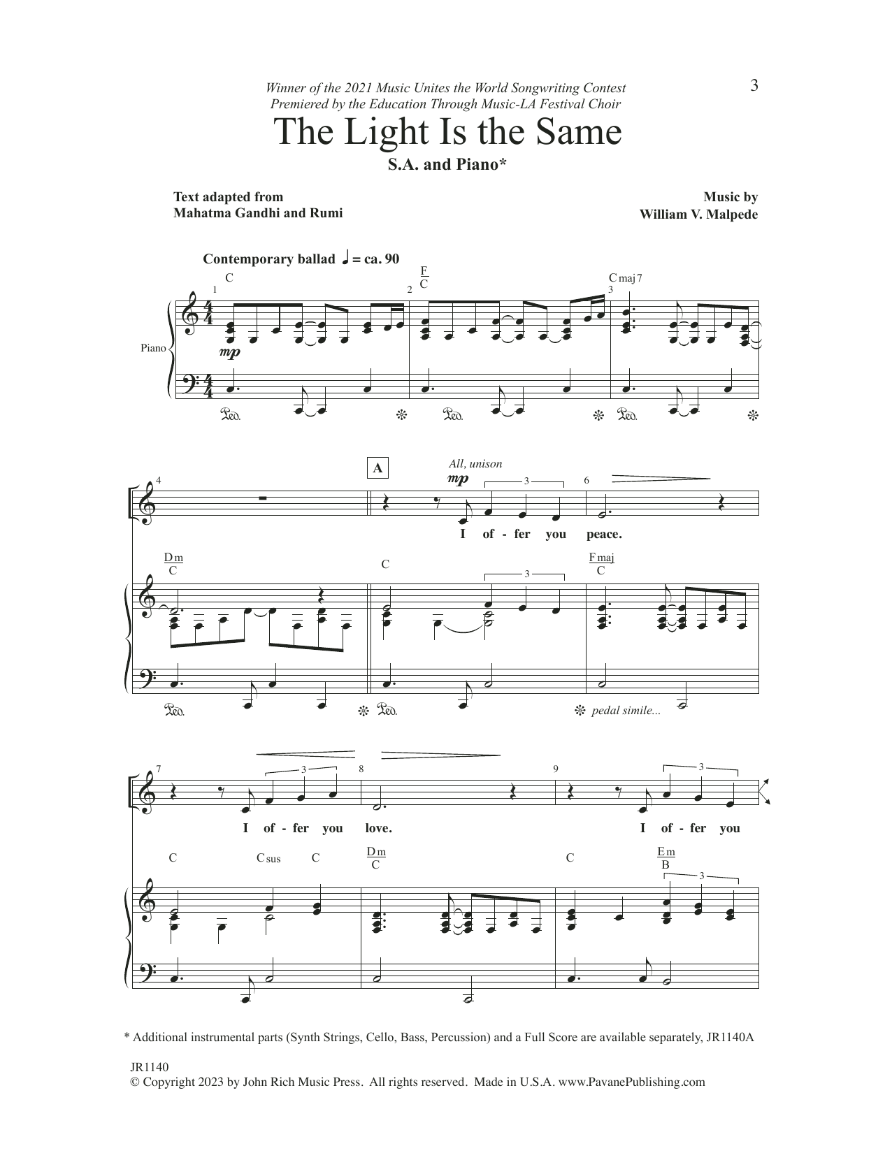Download or print William V. Malpede The Light Is The Same sheet music, chords and digital score arranged for 2-Part Choir. This Concert score includes 11 page(s).