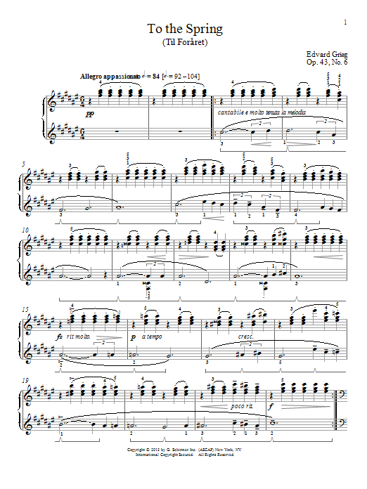 Download or print Edvard Grieg To The Spring (Til Foraret), Op. 43, No. 6 sheet music, chords and digital score arranged for Piano Solo. This Classical score includes 4 page(s).