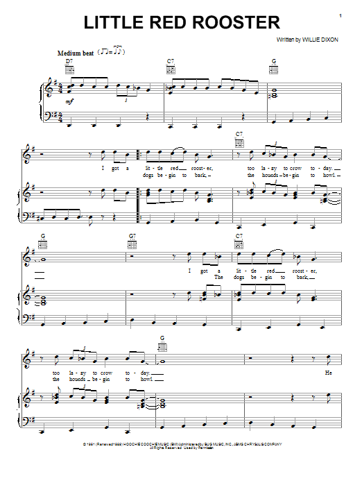 Download or print Willie Dixon Little Red Rooster sheet music, chords and digital score arranged for Piano, Vocal & Guitar Chords (Right-Hand Melody). This Blues score includes 3 page(s).