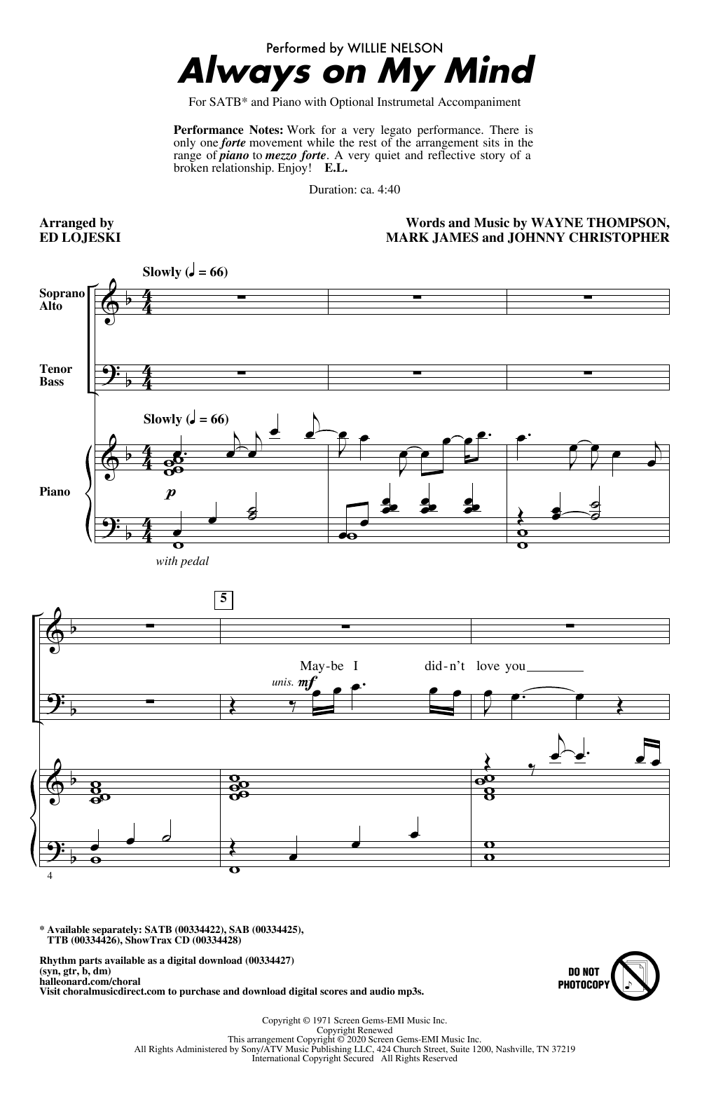 Download or print Willie Nelson Always On My Mind (arr. Ed Lojeski) sheet music, chords and digital score arranged for SAB Choir. This Pop score includes 10 page(s).