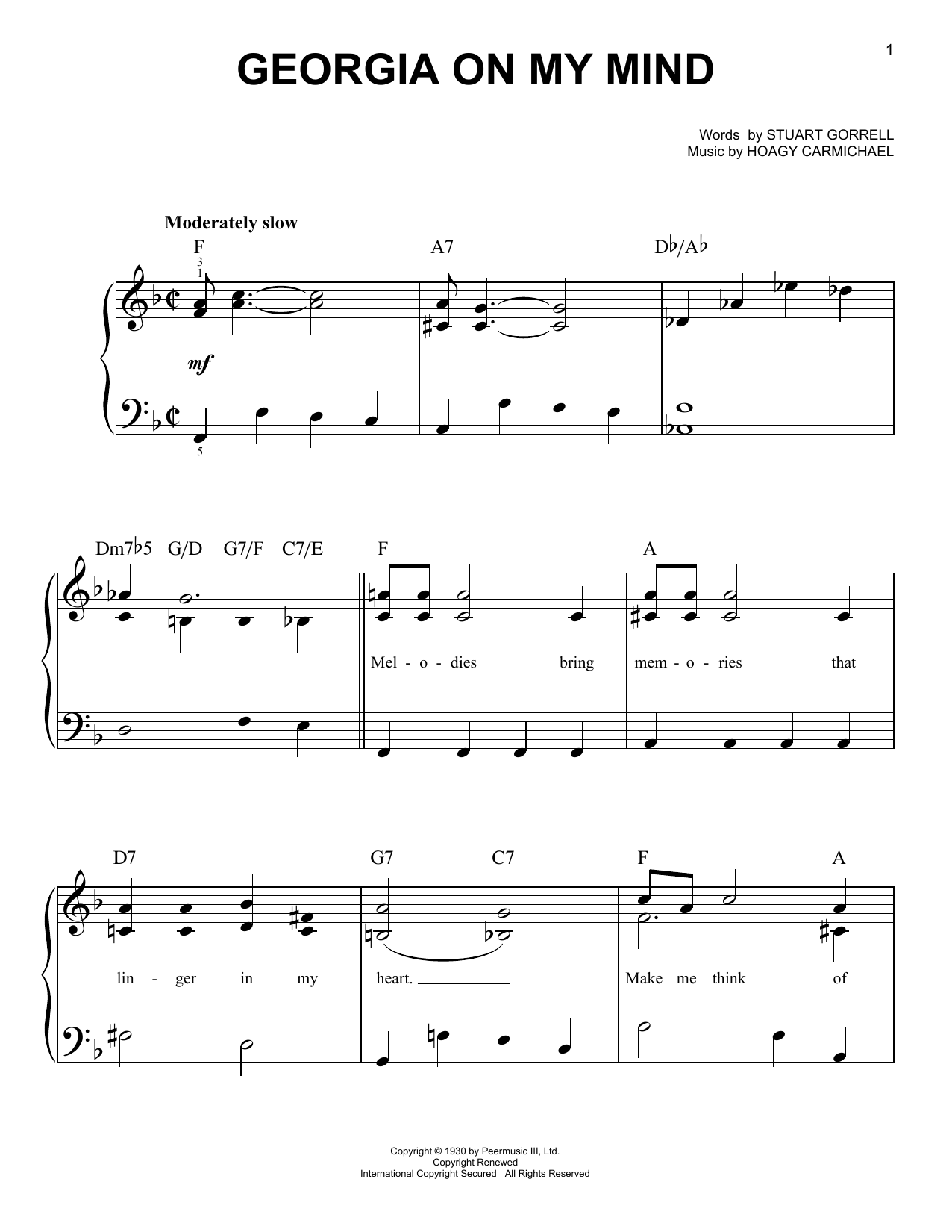 Download or print Willie Nelson Georgia On My Mind sheet music, chords and digital score arranged for Easy Piano. This Jazz score includes 5 page(s).