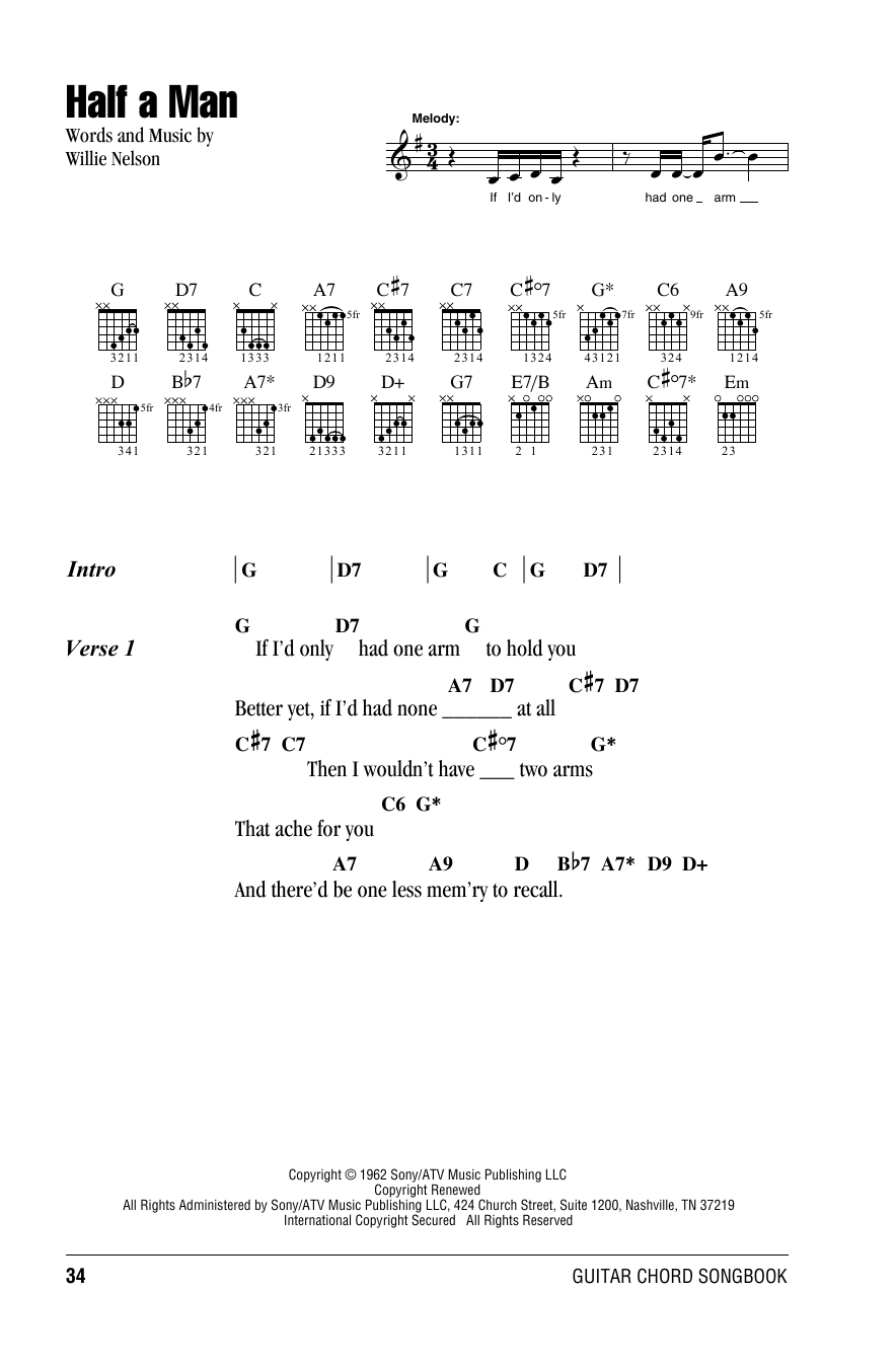 Download or print Willie Nelson Half A Man sheet music, chords and digital score arranged for Guitar Chords/Lyrics. This Country score includes 2 page(s).