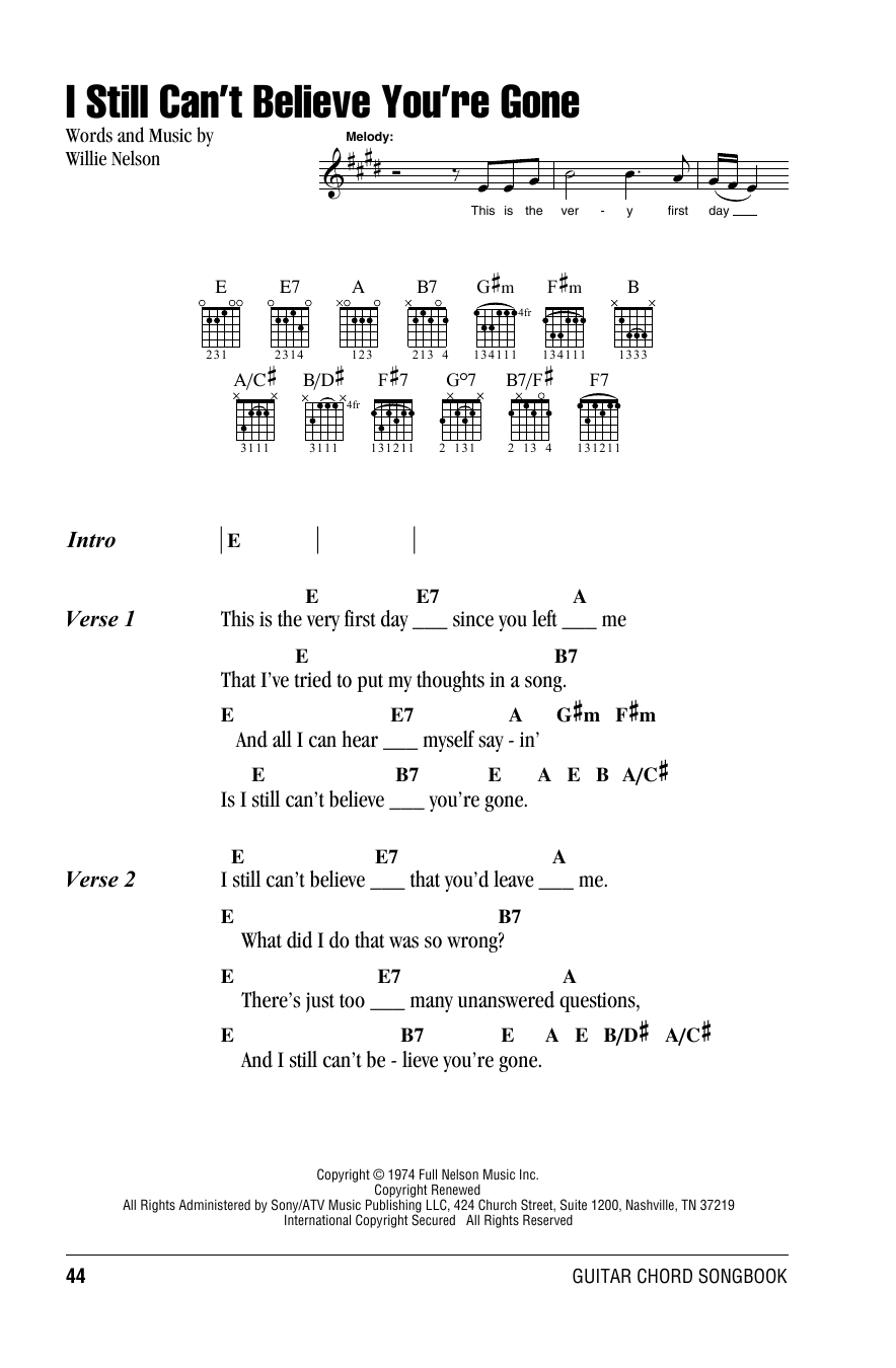 Download or print Willie Nelson I Still Can't Believe You're Gone sheet music, chords and digital score arranged for Guitar Chords/Lyrics. This Country score includes 2 page(s).