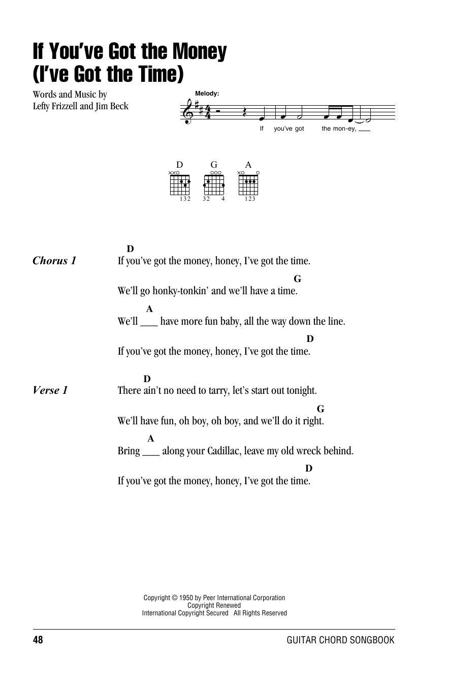 Download or print Willie Nelson If You've Got The Money (I've Got The Time) sheet music, chords and digital score arranged for Guitar Chords/Lyrics. This Country score includes 2 page(s).