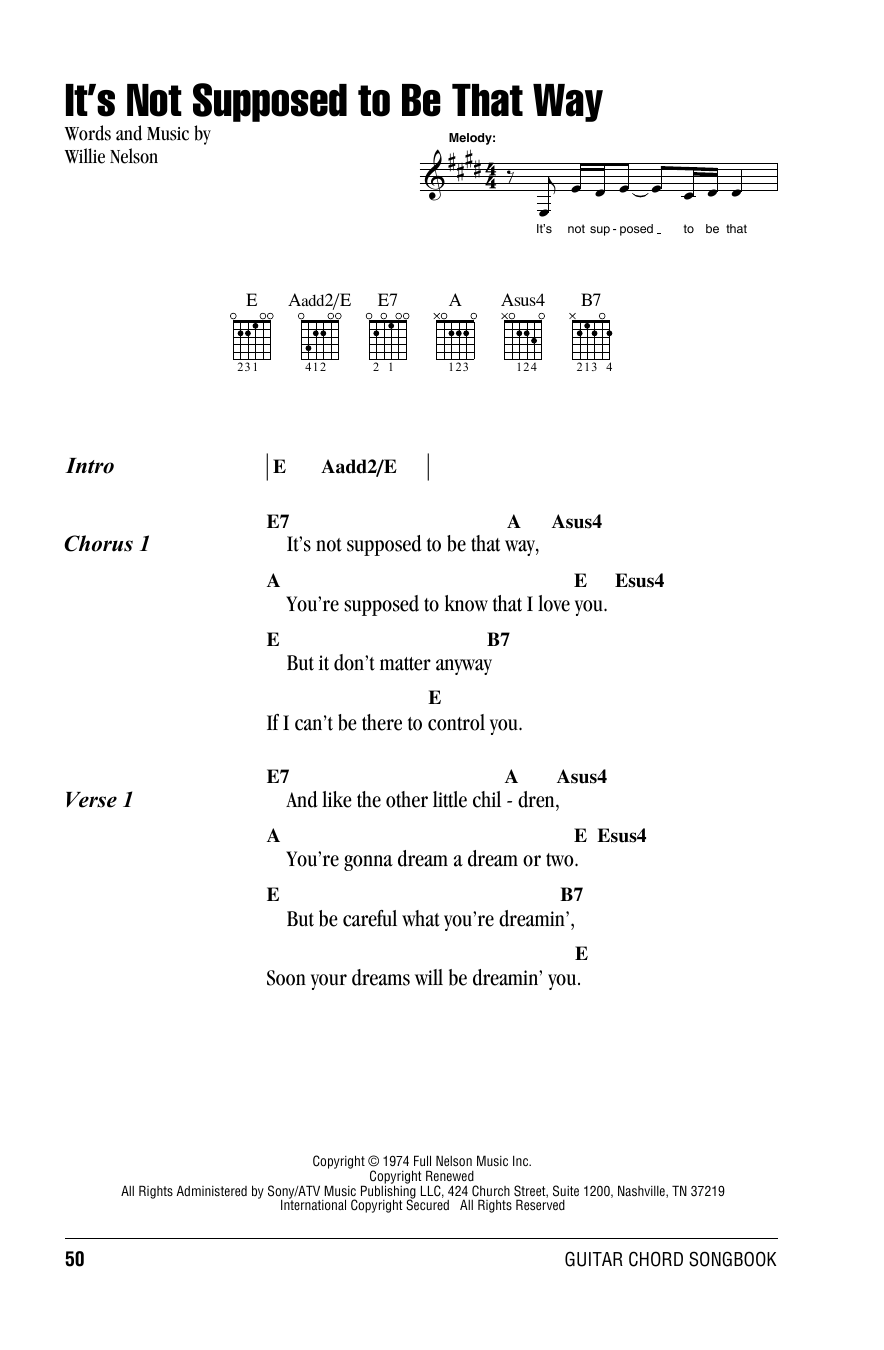 Download or print Willie Nelson It's Not Supposed To Be That Way sheet music, chords and digital score arranged for Guitar Chords/Lyrics. This Country score includes 2 page(s).