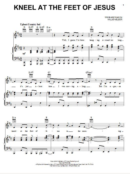 Download or print Willie Nelson Kneel At The Feet Of Jesus sheet music, chords and digital score arranged for Piano, Vocal & Guitar Chords (Right-Hand Melody). This Country score includes 7 page(s).