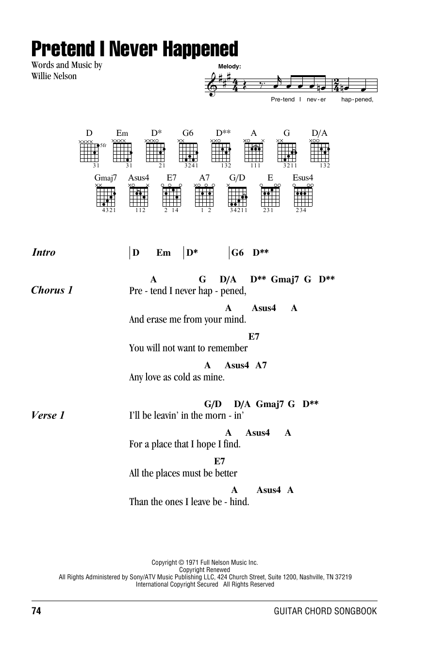 Download or print Willie Nelson Pretend I Never Happened sheet music, chords and digital score arranged for Guitar Chords/Lyrics. This Country score includes 2 page(s).
