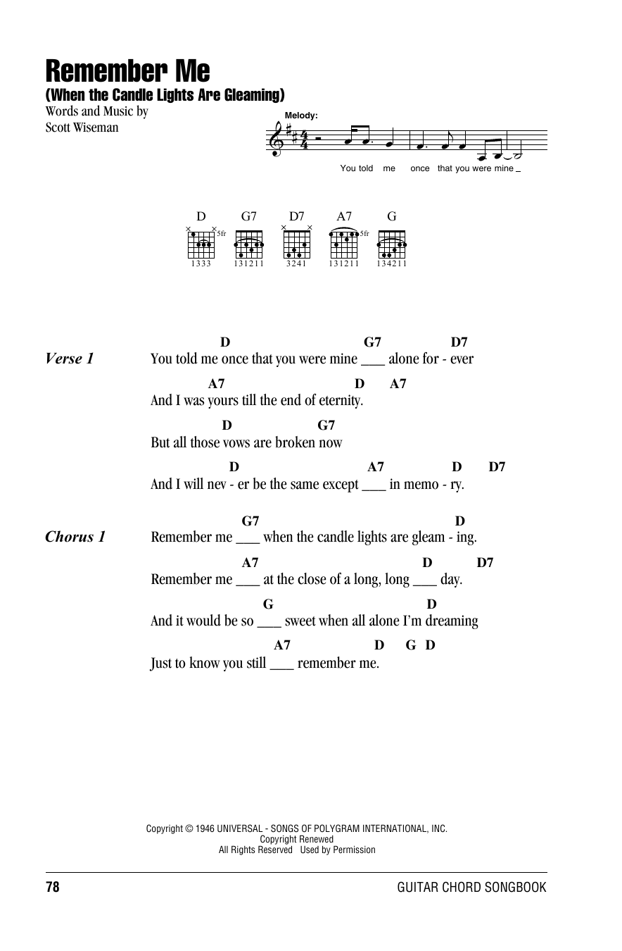 Download or print Willie Nelson Remember Me (When The Candle Lights Are Gleaming) sheet music, chords and digital score arranged for Guitar Chords/Lyrics. This Country score includes 2 page(s).