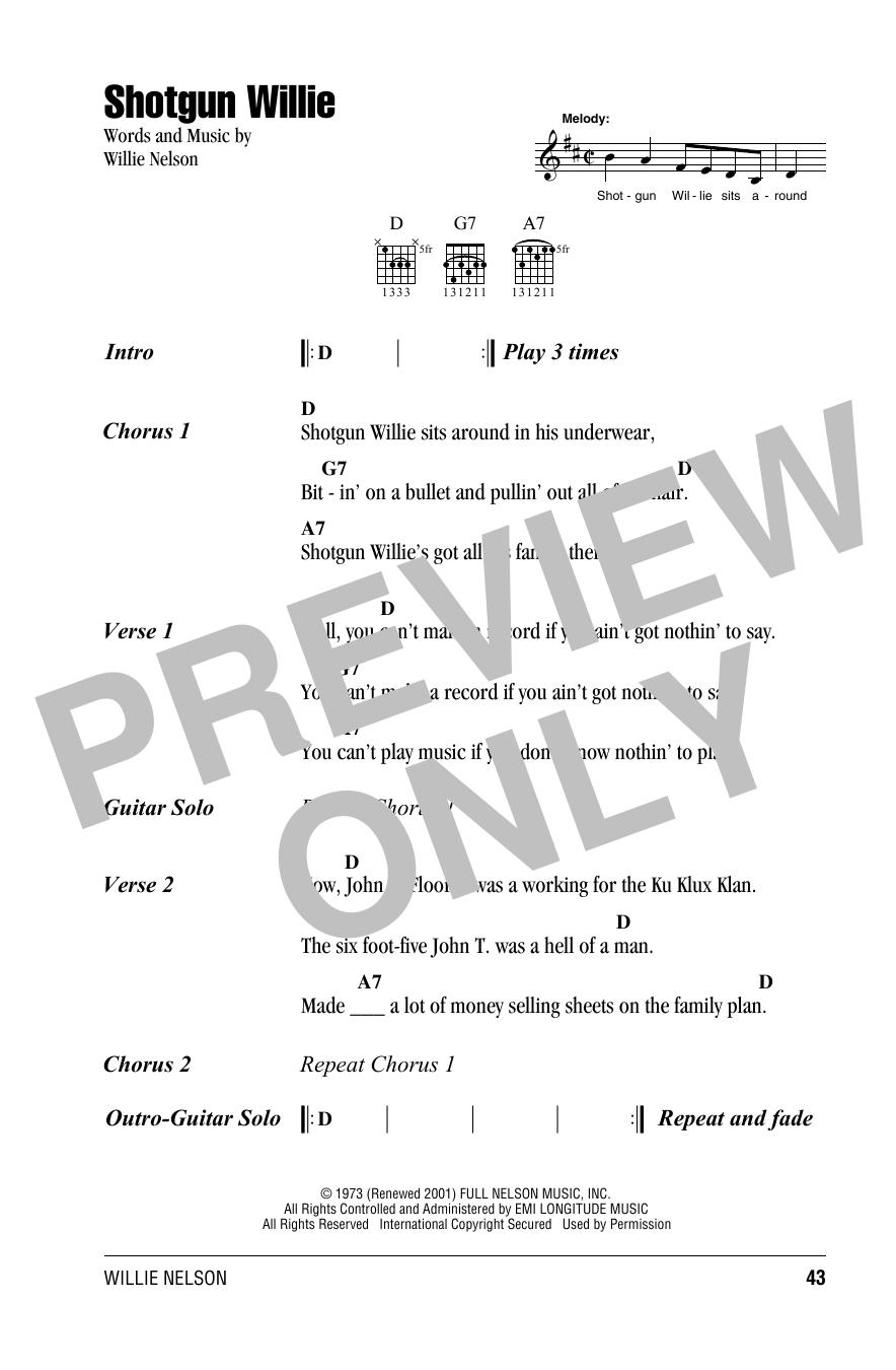 Download or print Willie Nelson Shotgun Willie sheet music, chords and digital score arranged for Guitar Chords/Lyrics. This Country score includes 1 page(s).