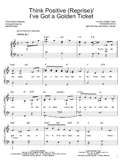Download or print Willy Wonka Think Positive (Reprise) sheet music, chords and digital score arranged for Easy Piano. This Children score includes 7 page(s).