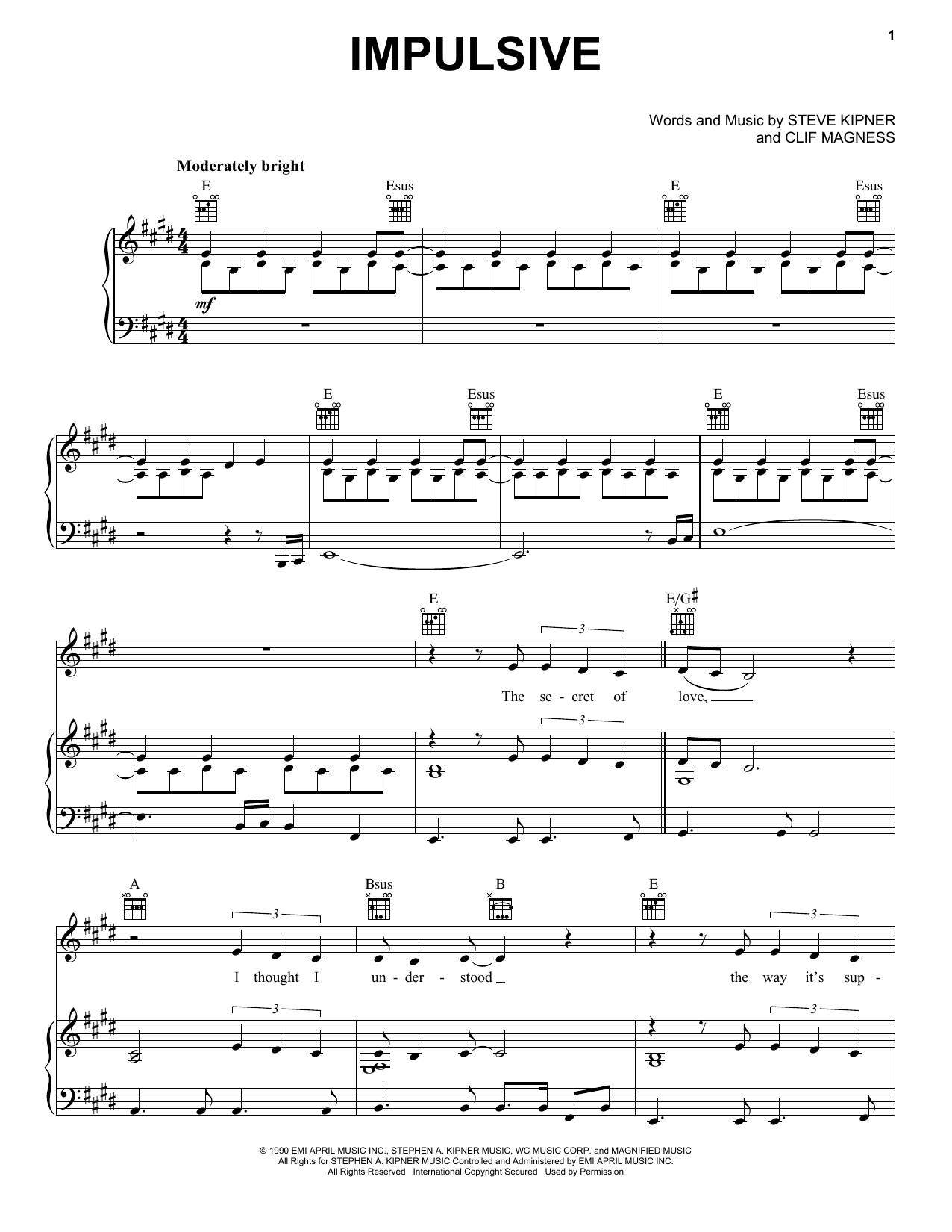 Download or print Wilson Phillips Impulsive sheet music, chords and digital score arranged for Piano, Vocal & Guitar Chords (Right-Hand Melody). This Pop score includes 8 page(s).