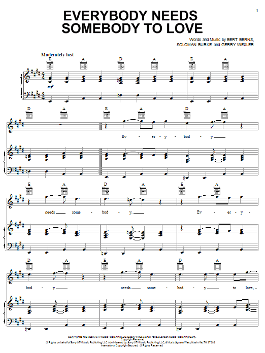 Download or print Wilson Pickett Everybody Needs Somebody To Love sheet music, chords and digital score arranged for Piano, Vocal & Guitar Chords (Right-Hand Melody). This Film/TV score includes 5 page(s).