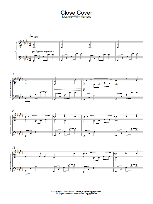 Download or print Wim Mertens Close Cover sheet music, chords and digital score arranged for Piano Solo. This Pop score includes 5 page(s).
