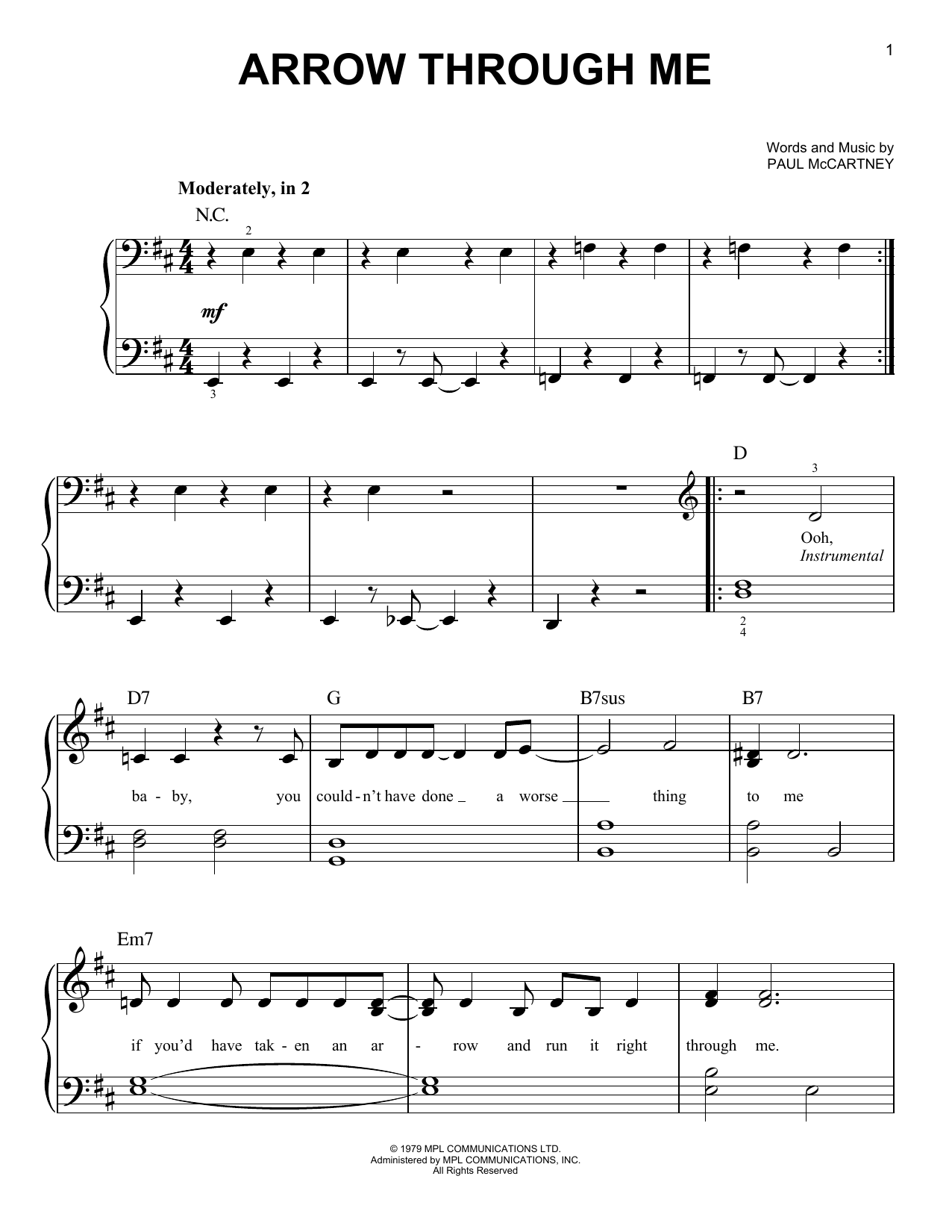 Download or print Wings Arrow Through Me sheet music, chords and digital score arranged for Easy Piano. This Pop score includes 4 page(s).