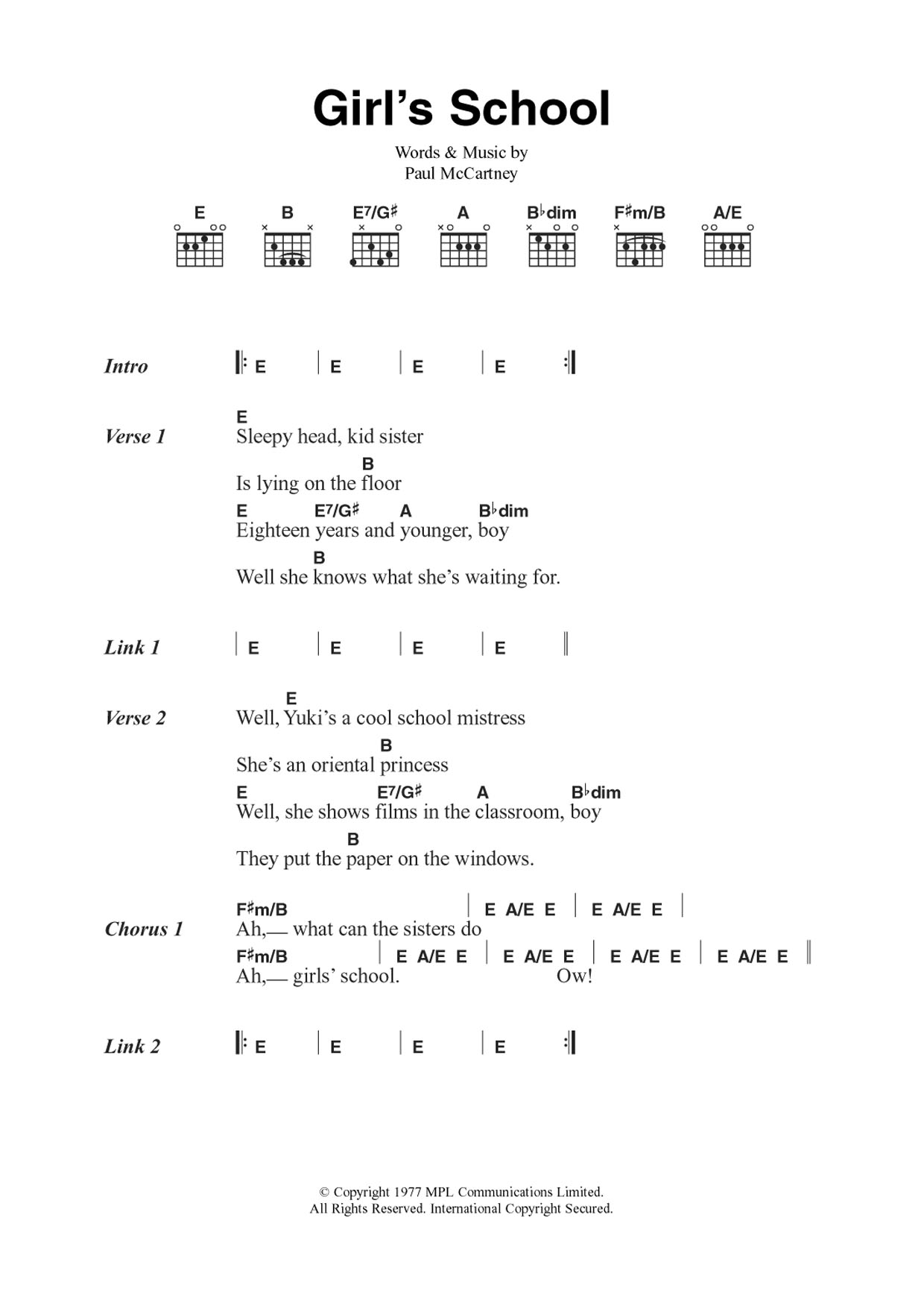Download or print Wings Girls' School sheet music, chords and digital score arranged for Guitar Chords/Lyrics. This Pop score includes 2 page(s).