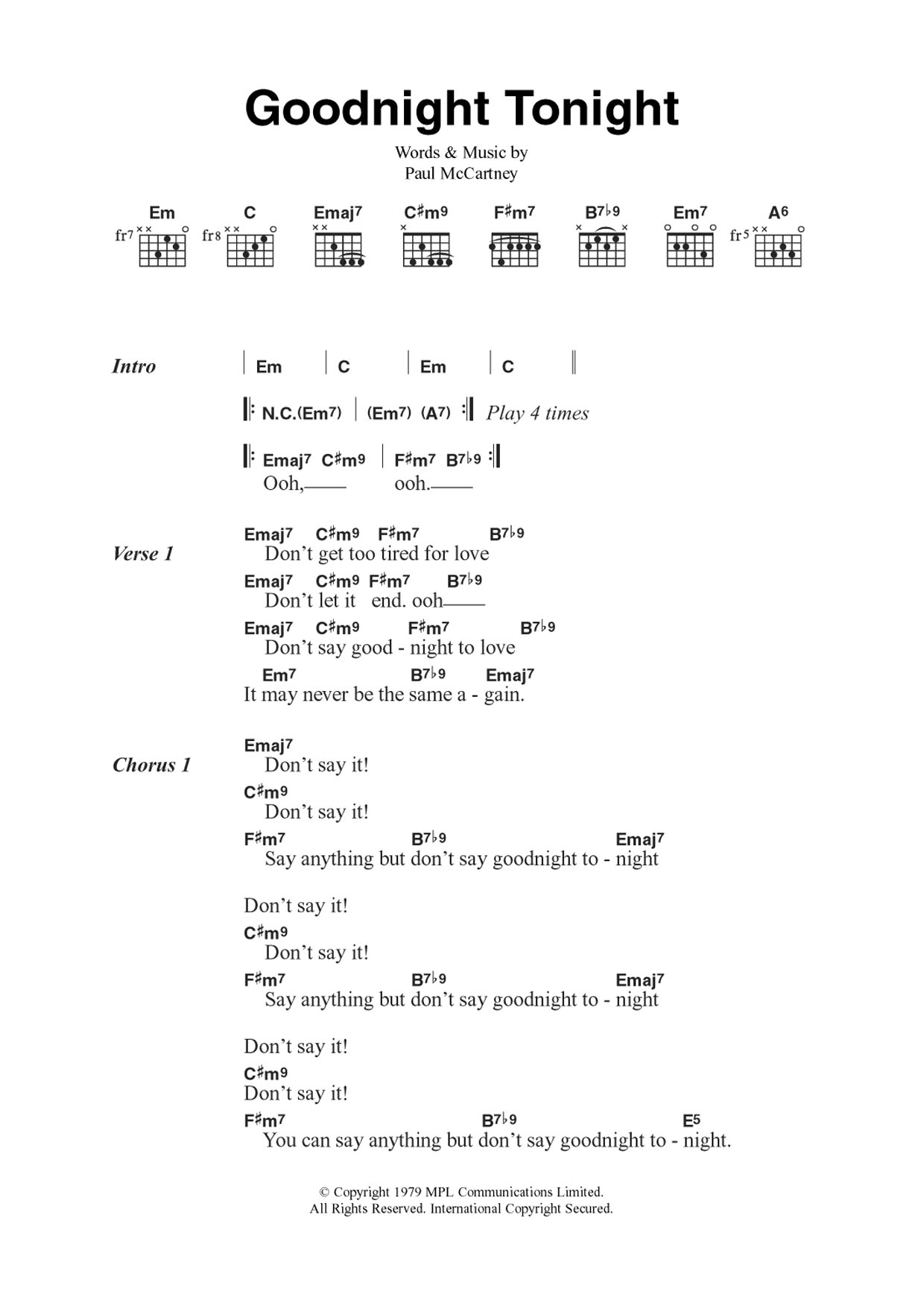 Download or print Wings Goodnight Tonight sheet music, chords and digital score arranged for Guitar Chords/Lyrics. This Pop score includes 3 page(s).