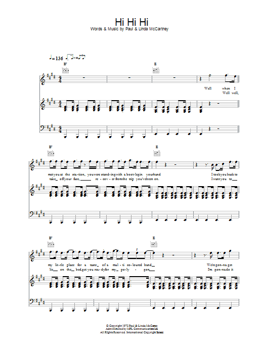 Download or print Wings Hi Hi Hi sheet music, chords and digital score arranged for Guitar Chords/Lyrics. This Pop score includes 3 page(s).