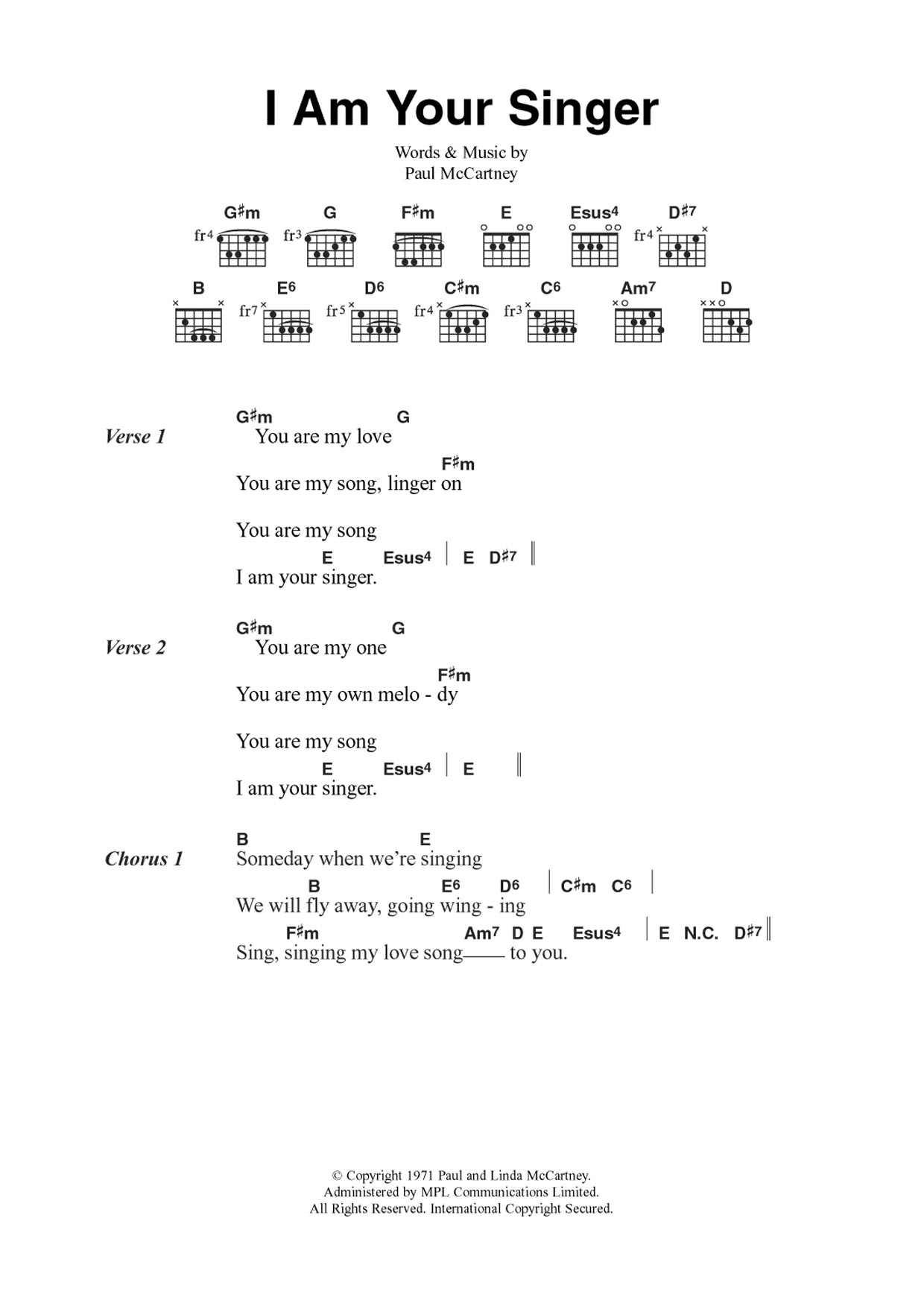 Download or print Wings I Am Your Singer sheet music, chords and digital score arranged for Guitar Chords/Lyrics. This Pop score includes 2 page(s).