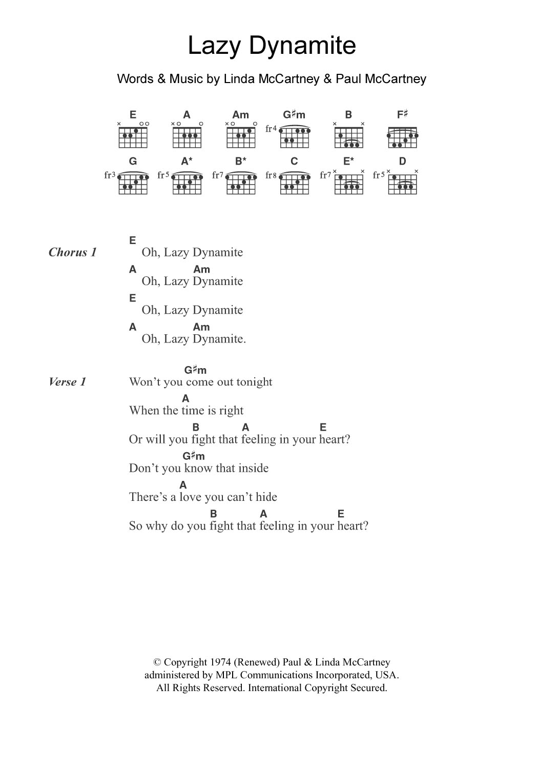 Download or print Wings Lazy Dynamite sheet music, chords and digital score arranged for Guitar Chords/Lyrics. This Pop score includes 2 page(s).