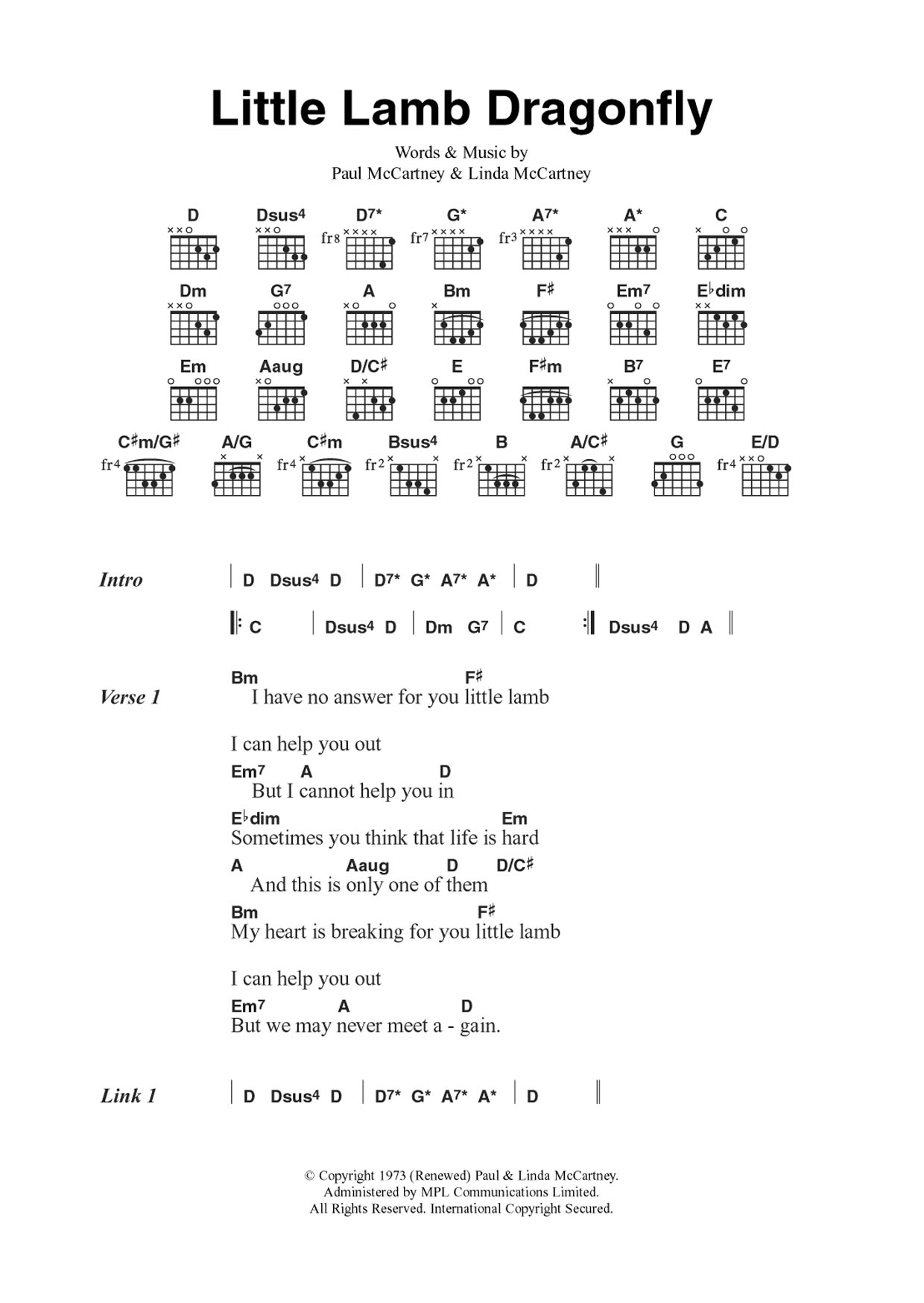 Download or print Wings Little Lamb Dragonfly sheet music, chords and digital score arranged for Guitar Chords/Lyrics. This Pop score includes 3 page(s).