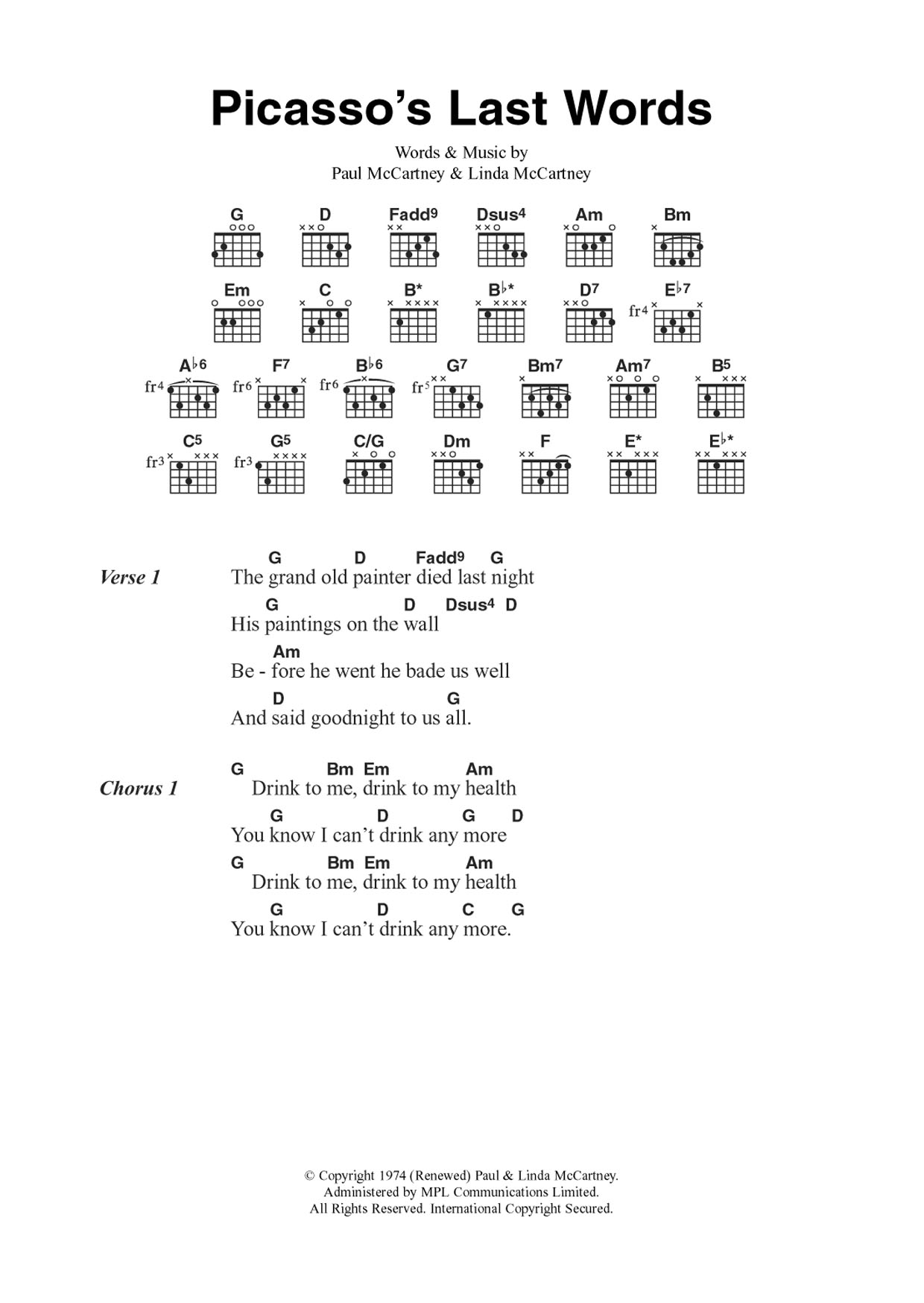 Download or print Wings Picasso's Last Words sheet music, chords and digital score arranged for Guitar Chords/Lyrics. This Pop score includes 3 page(s).