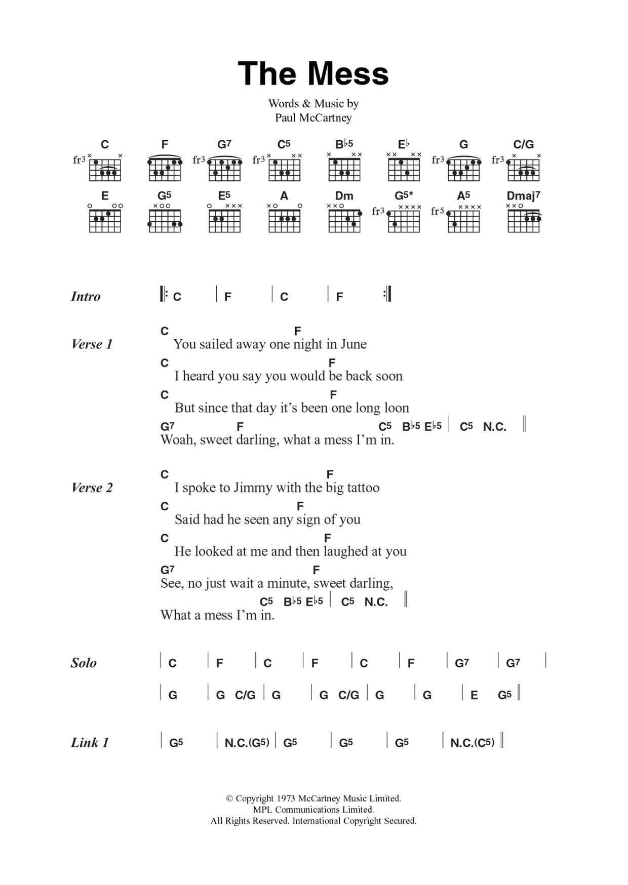 Download or print Wings The Mess sheet music, chords and digital score arranged for Guitar Chords/Lyrics. This Pop score includes 2 page(s).