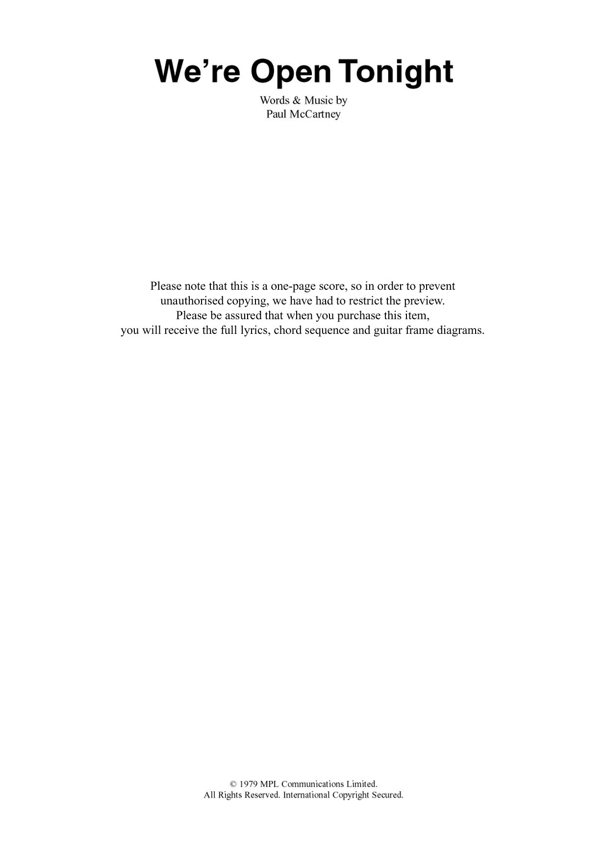 Download or print Wings We're Open Tonight sheet music, chords and digital score arranged for Piano, Vocal & Guitar Chords (Right-Hand Melody). This Pop score includes 2 page(s).