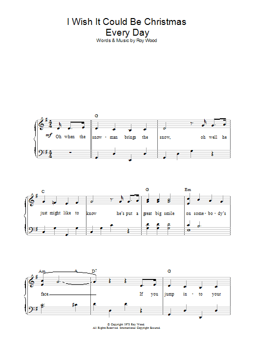 Download or print Wizzard I Wish It Could Be Christmas Every Day sheet music, chords and digital score arranged for Easy Piano. This Christmas score includes 3 page(s).