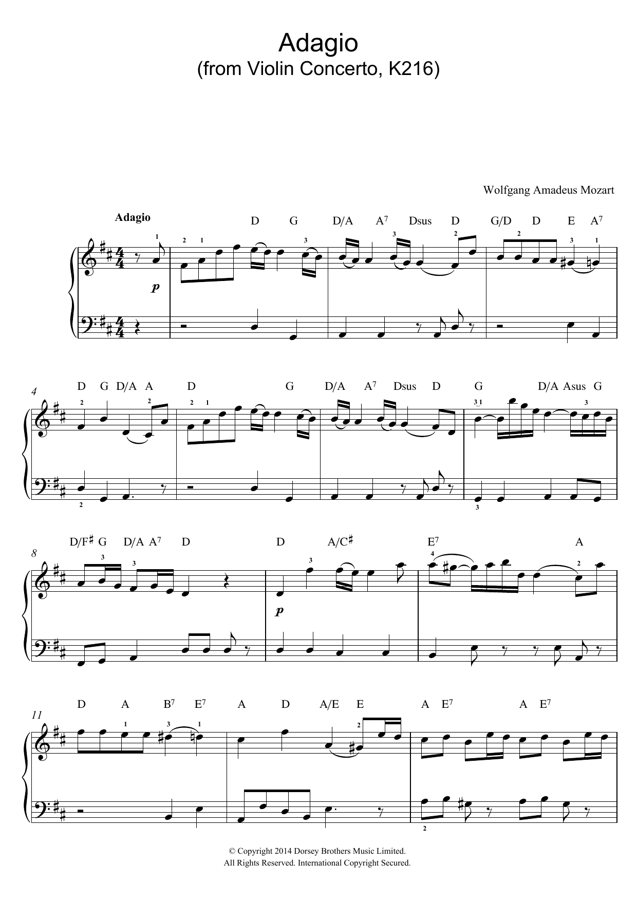 Download or print Wolfgang Amadeus Mozart Adagio from Violin Concerto In G, K216 sheet music, chords and digital score arranged for Beginner Piano (Abridged). This Classical score includes 2 page(s).