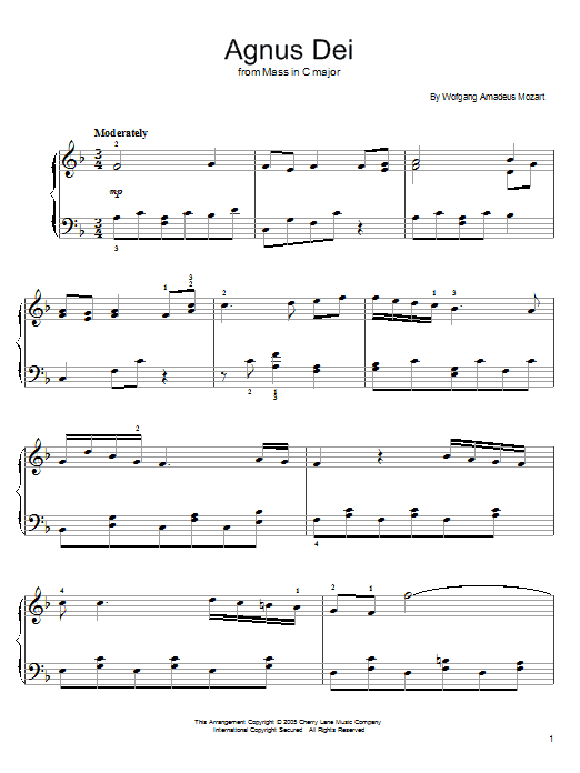 Download or print Wolfgang Amadeus Mozart Agnus Dei, Excerpt sheet music, chords and digital score arranged for Easy Piano. This Classical score includes 2 page(s).