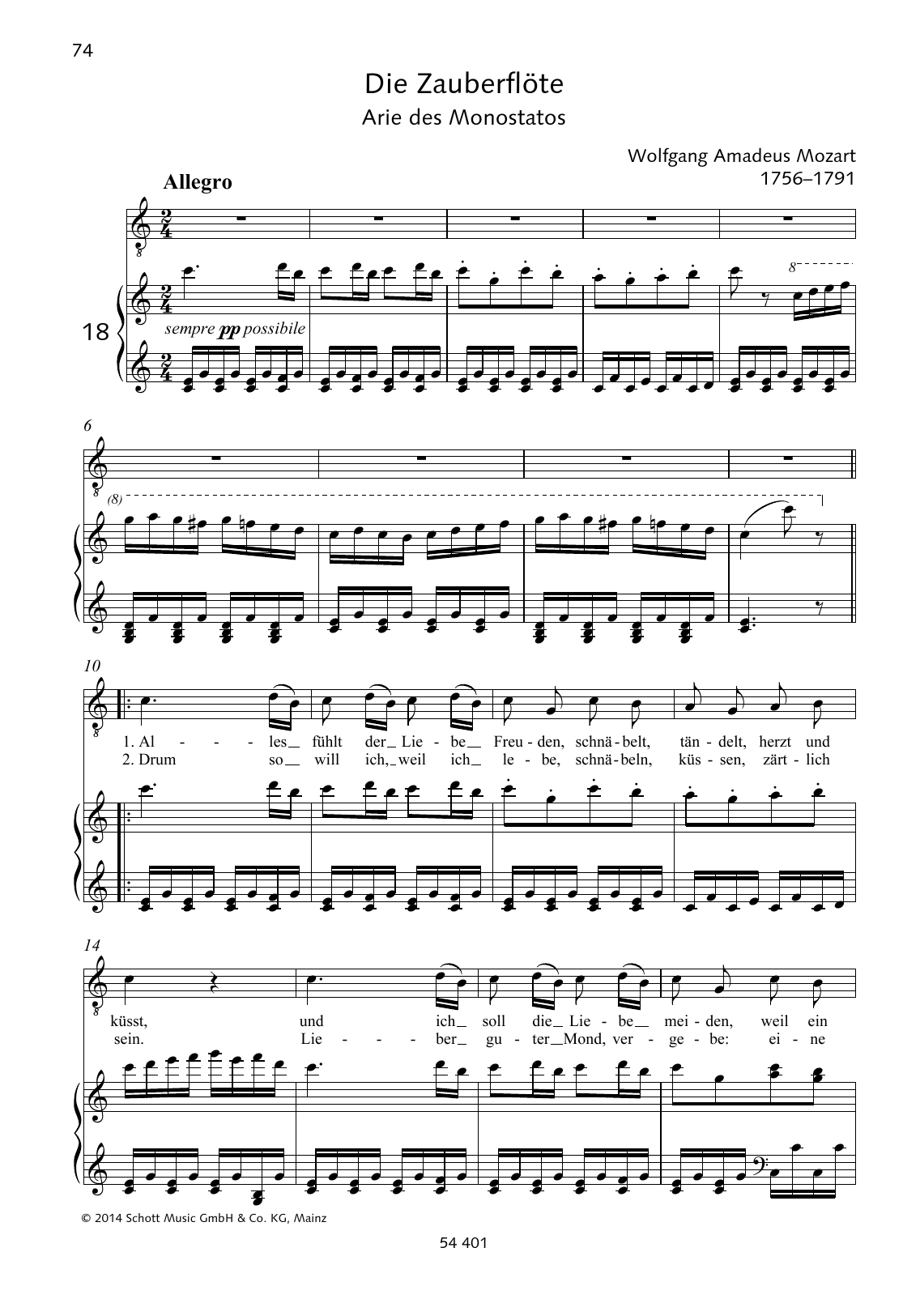 Download or print Wolfgang Amadeus Mozart Alles fühlt der Liebe Freuden sheet music, chords and digital score arranged for Piano & Vocal. This Classical score includes 3 page(s).