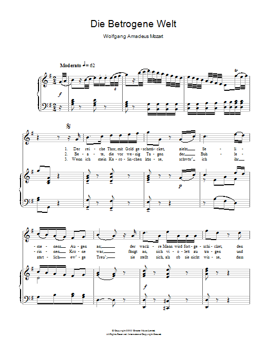 Download or print Wolfgang Amadeus Mozart Die Betrogene Welt (The Deceiving World) K.474 sheet music, chords and digital score arranged for Piano & Vocal. This Classical score includes 3 page(s).