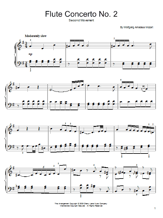Download or print Wolfgang Amadeus Mozart Flute Concerto No. 2, 2nd Movement sheet music, chords and digital score arranged for Flute Solo. This Classical score includes 2 page(s).
