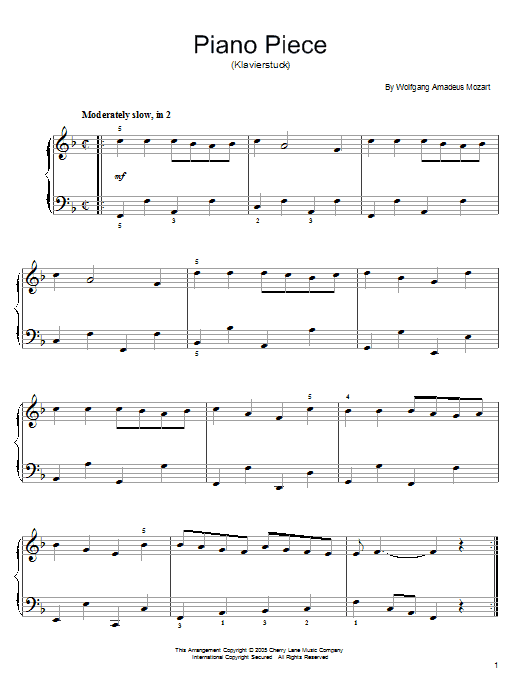 Download or print Wolfgang Amadeus Mozart Piano Piece (Klavierstuck) sheet music, chords and digital score arranged for Easy Piano. This Classical score includes 2 page(s).