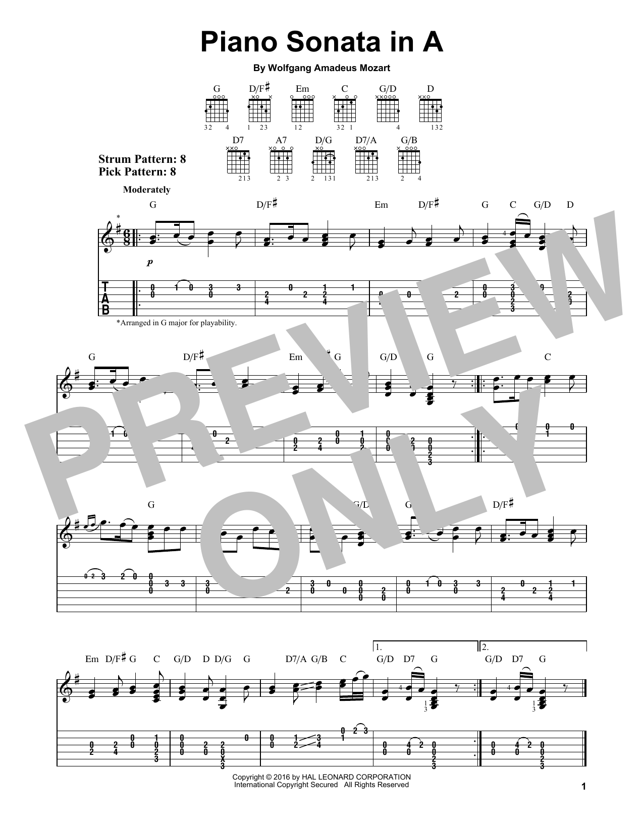 Download or print Wolfgang Amadeus Mozart Piano Sonata In A sheet music, chords and digital score arranged for Easy Guitar Tab. This Classical score includes 1 page(s).