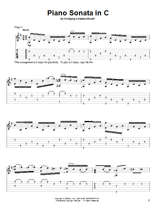 Download or print Wolfgang Amadeus Mozart Piano Sonata In C sheet music, chords and digital score arranged for Solo Guitar. This Classical score includes 5 page(s).