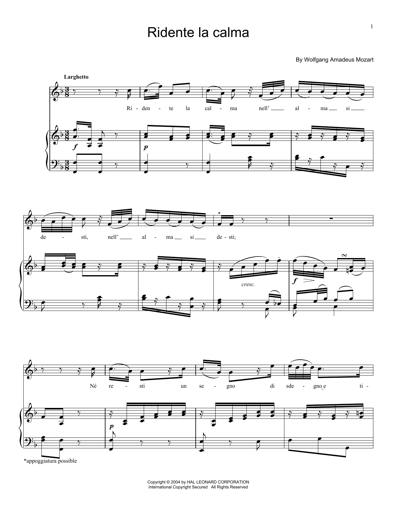 Download or print Wolfgang Amadeus Mozart Ridente La Calma, K. 152 sheet music, chords and digital score arranged for Piano & Vocal. This Classical score includes 5 page(s).