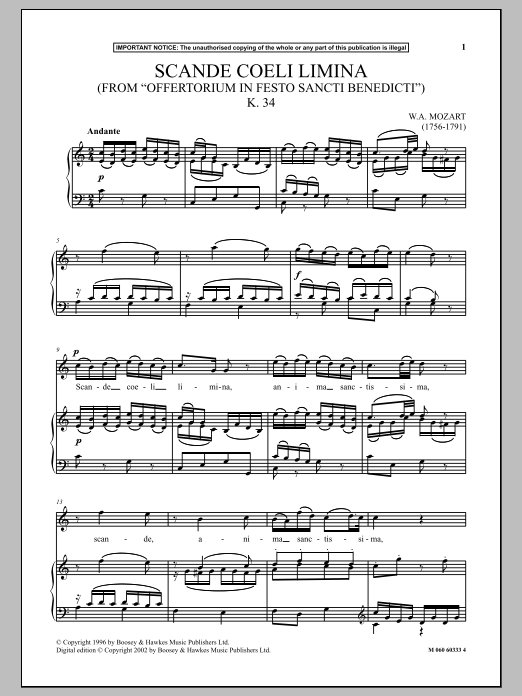 Download or print Wolfgang Amadeus Mozart Scande Coeli Limina (from Offertorium In Fest K. 34) sheet music, chords and digital score arranged for Piano & Vocal. This Classical score includes 5 page(s).