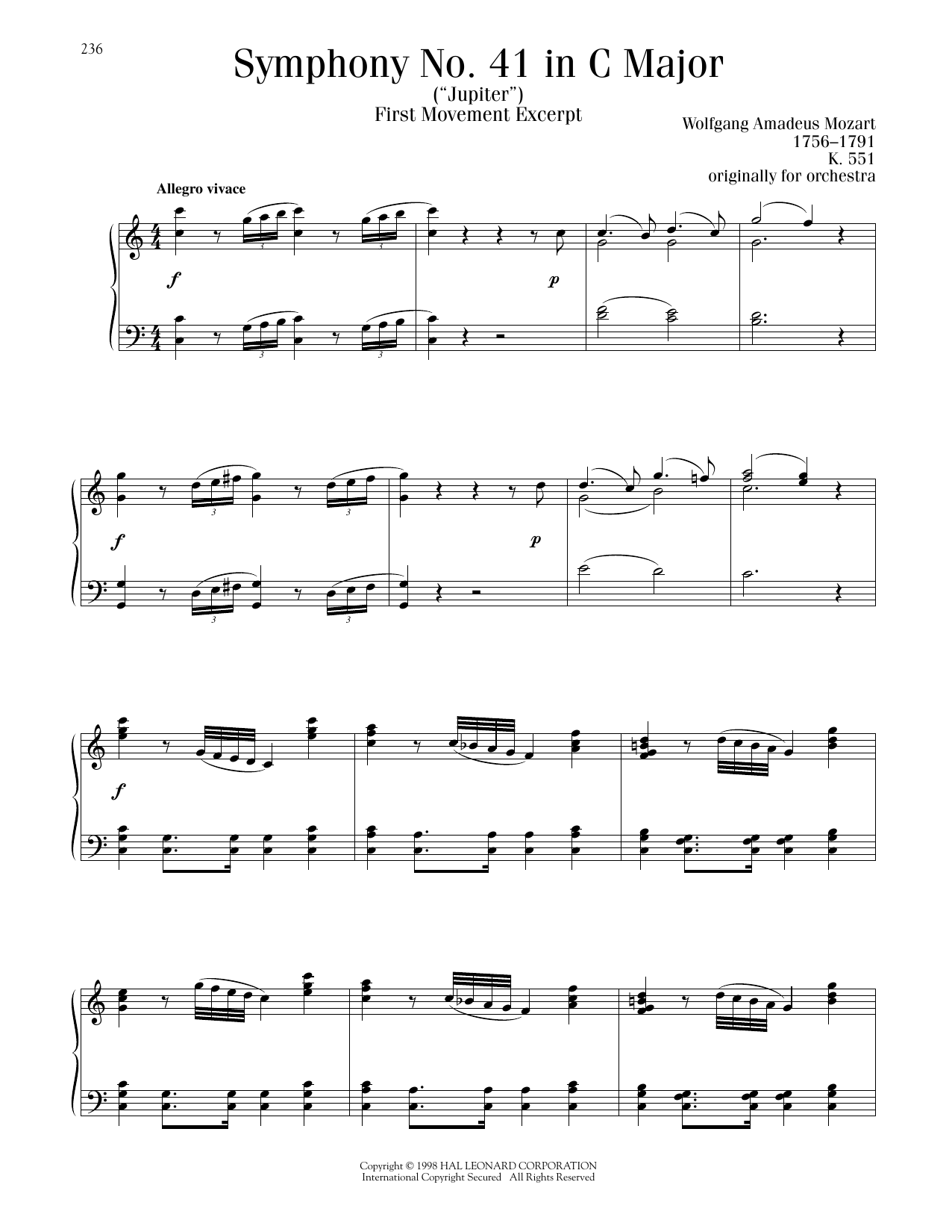 Download or print Wolfgang Amadeus Mozart Symphony No. 41 In C Major ("Jupiter"), First Movement Excerpt sheet music, chords and digital score arranged for Piano Solo. This Classical score includes 5 page(s).