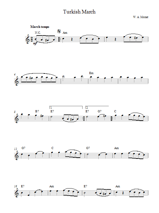 Download or print Wolfgang Amadeus Mozart Turkish March sheet music, chords and digital score arranged for Clarinet Solo. This Classical score includes 2 page(s).