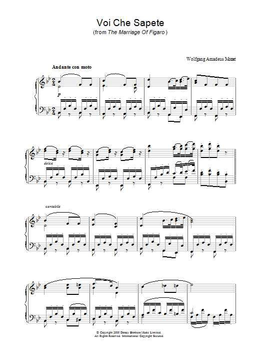 Download or print Wolfgang Amadeus Mozart Voi Che Sapete (from The Marriage Of Figaro) sheet music, chords and digital score arranged for Piano, Vocal & Guitar Chords. This Classical score includes 5 page(s).