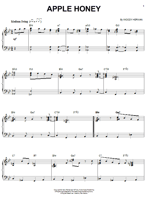 Download or print Woody Herman Apple Honey sheet music, chords and digital score arranged for Real Book – Melody & Chords – Bass Clef Instruments. This Jazz score includes 2 page(s).