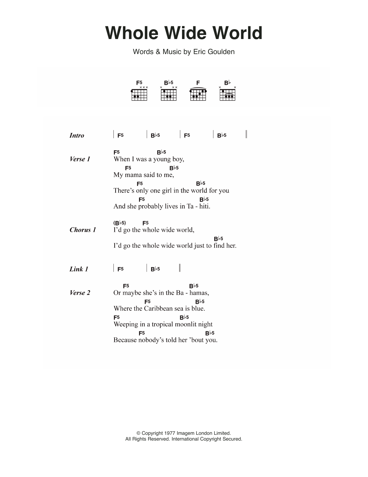 Download or print Wreckless Eric Whole Wide World sheet music, chords and digital score arranged for Guitar Chords/Lyrics. This Rock score includes 3 page(s).