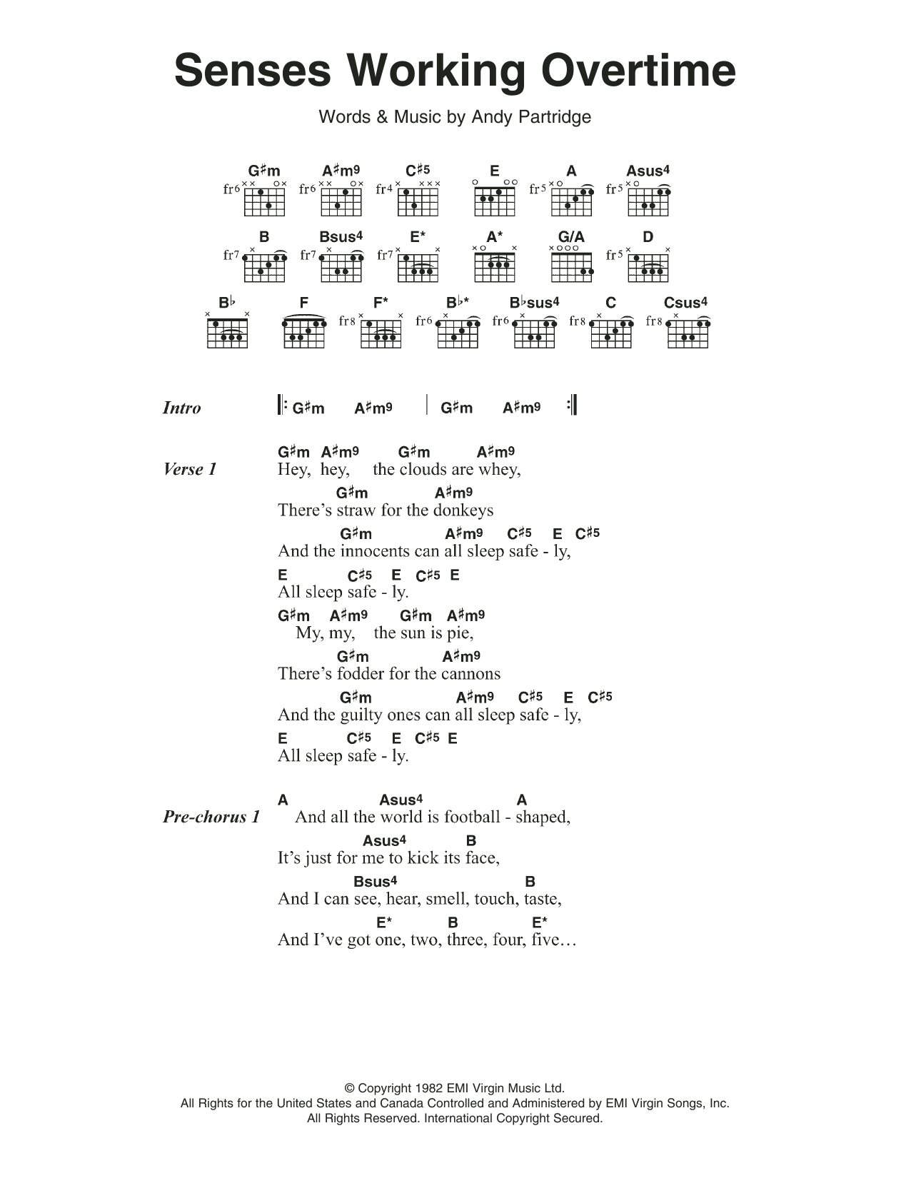 Download or print XTC Senses Working Overtime sheet music, chords and digital score arranged for Guitar Chords/Lyrics. This Rock score includes 3 page(s).