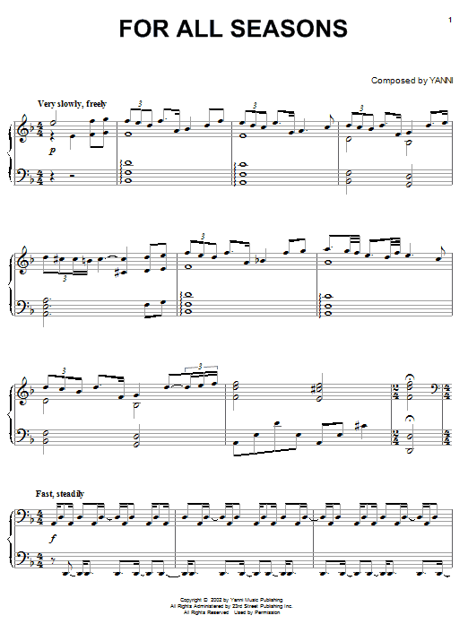 Download or print Yanni For All Seasons sheet music, chords and digital score arranged for Piano Solo. This New Age score includes 10 page(s).
