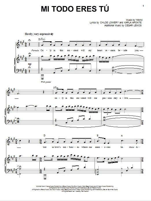 Download or print Yanni Mi Todo Eres Tu sheet music, chords and digital score arranged for Piano, Vocal & Guitar Chords (Right-Hand Melody). This New Age score includes 8 page(s).