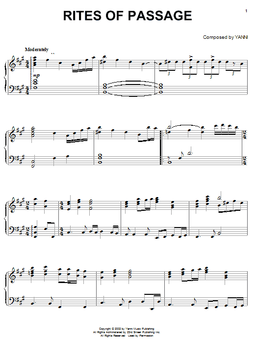 Download or print Yanni Rites Of Passage sheet music, chords and digital score arranged for Piano Solo. This New Age score includes 5 page(s).