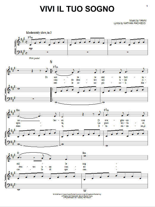 Download or print Yanni Vivi Il Tuo Sogno sheet music, chords and digital score arranged for Piano, Vocal & Guitar Chords (Right-Hand Melody). This New Age score includes 5 page(s).