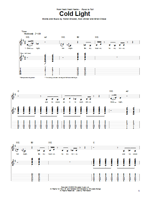 Download or print Yeah Yeah Yeahs Cold Light sheet music, chords and digital score arranged for Guitar Tab. This Pop score includes 6 page(s).