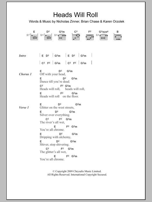 Download or print Yeah Yeah Yeahs Heads Will Roll sheet music, chords and digital score arranged for Guitar Chords/Lyrics. This Rock score includes 3 page(s).